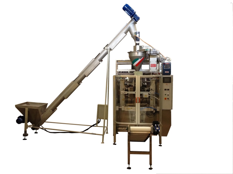 Baliaci stroj s volumetrickým skrutkovým dávkovačom pre nekvapalné práškové produkty ako sú múka, prášková káva, sušené mlieko, kakao, zemiakový škrob, zmrzlinová zmes a práškové korenie.