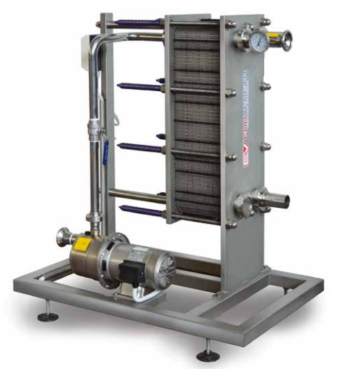 Výmenník s kontinuálnym prietokom pozostáva z doskového výmenníka, obehového čerpadla a ovládacieho panelu, namontovaného na nerezovom ráme.
