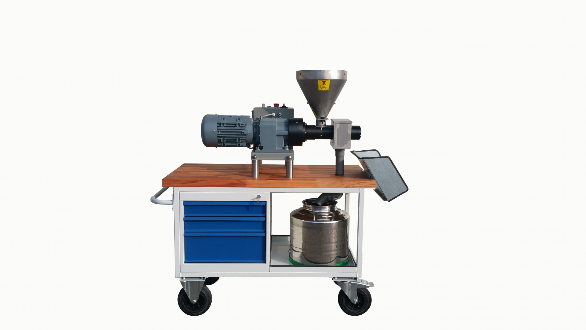 – Vozík na lisovanie oleja s kolieskami, posúvačom lisovaného koláča, zbernou nádobkou na olej (SS 1.4301), priechodkou na olejový kábel (PE), nádobkou na surový olej 30 l (SS 1.4301)