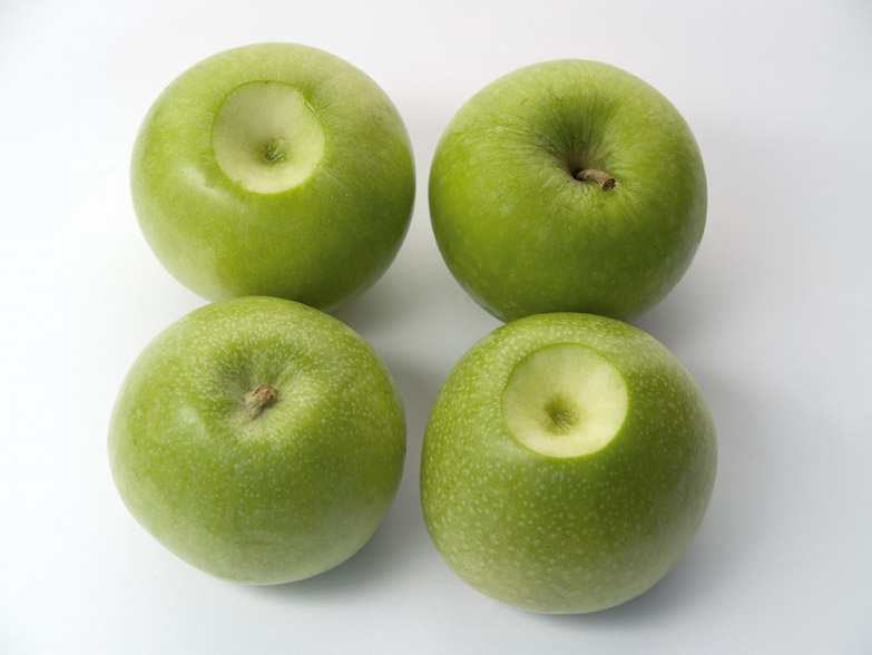 Tento stroj odstráni jablkové stopky pri výkone 450 jabĺk za minútu.