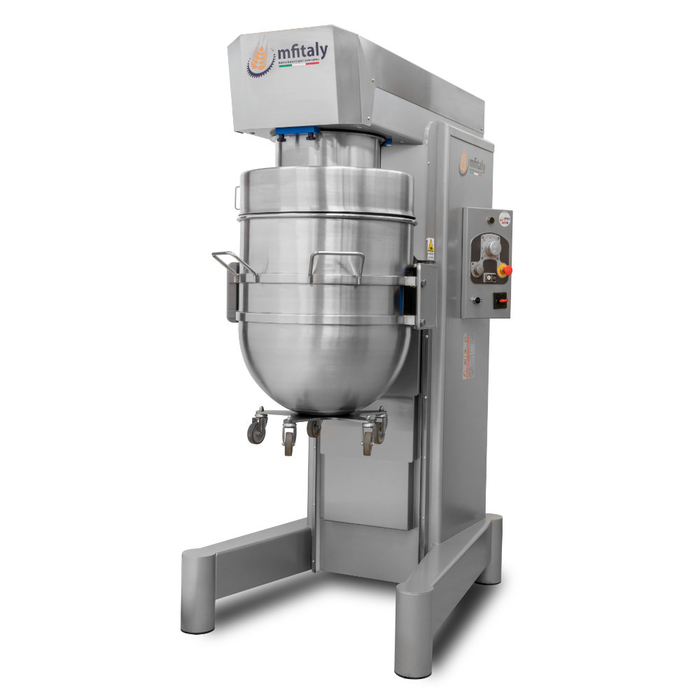 Automatické zdvíhanie nádoby so zvýšeným zdvihom pre jej extrakciu. Nádoba a nástroje (stierka, šľahacia metla a hák) sú vyrobené z nehrdzavejúcej ocele.