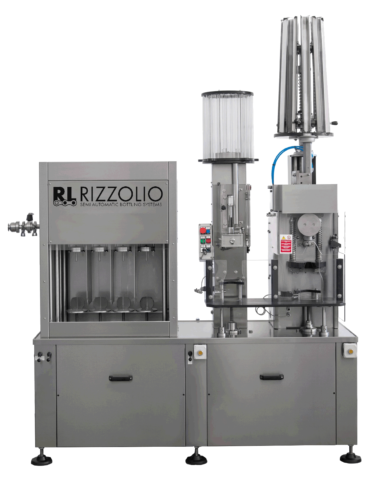 Stroj je vybavený 4 plniacimi ventilmi, ktoré umožňujú plnenie dvoch fliaš naraz, takže zatiaľ čo stroj vykonáva plnenie na jednej strane, na druhej strane je možné fľašu vyložiť a naložiť.