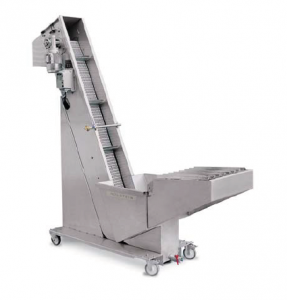 Osvedčený šikmý dopravník na prepravu jabĺk a hrušiek. Rýchlosť dopravníka je možné plynule regulovať; pevné a spoľahlivé zariadenie – prirodzene z nehrdzavejúcej ocele …