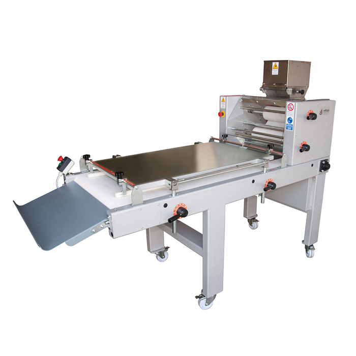 Rezy vstupujú do násypky a následne sú zlisované na požadovanú hrúbku medzi dvoma pármi valcov. Cesto sa potom zvinie do bochníka a vytvaruje sa pod lisovacím stolom.