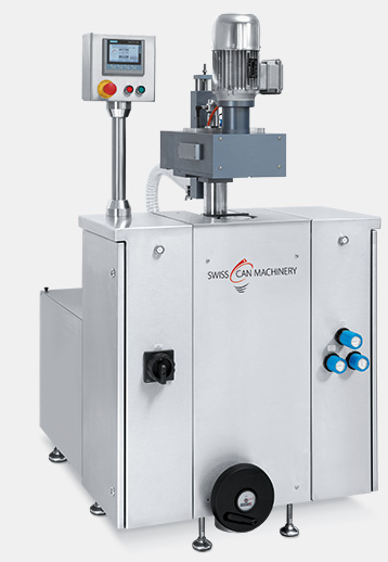 Poloautomatický stroj na obrubovanie plechoviek.