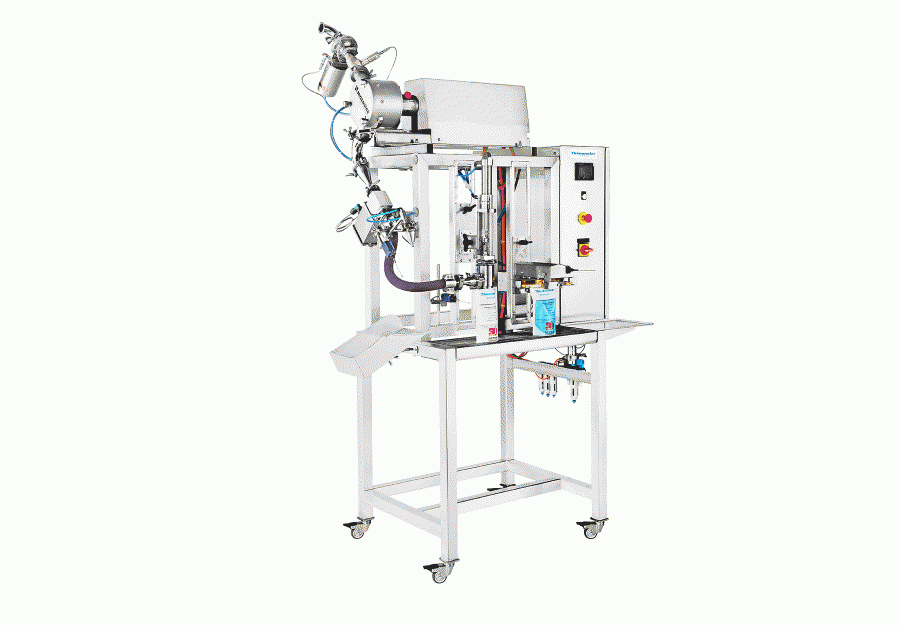 Poloautomatický utesňovací a plniaci stroj pre kvapalné a viskózne produkty.
