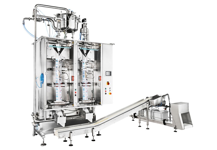 Vertikálny utesňovací a plniaci stroj pre balenie kvapalných a viskóznych produktov do vreciek Pillow Pouch.