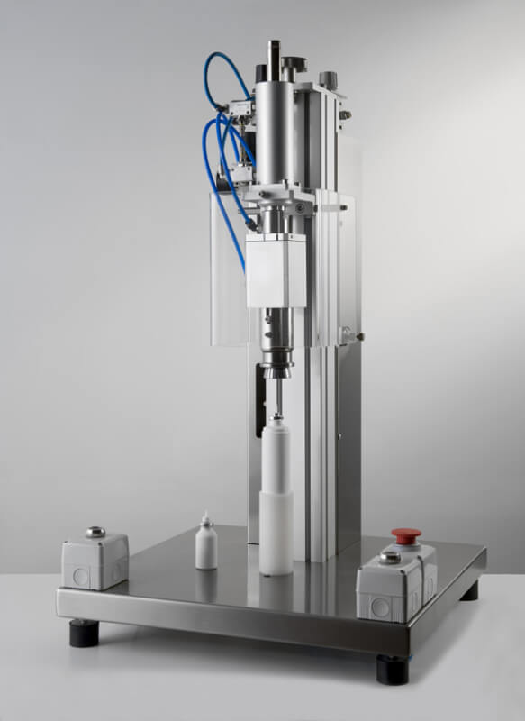 Poloautomatické stolné uzatváracie zariadenie pre PFP uzávery s plastovým nalievačom alebo bez neho, farmaceutické uzávery pre injekčné roztoky, UT a FEA kapsuly …