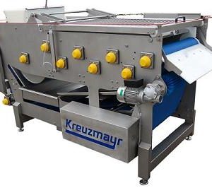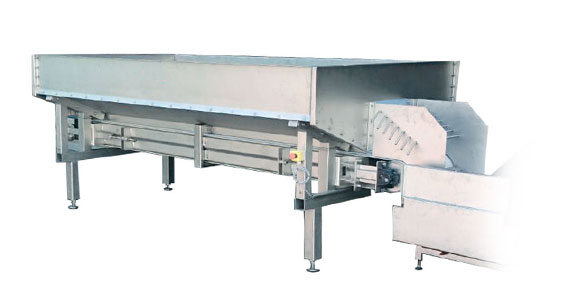 The stand construction is made entirely of stainless steel, built on 4 adjustable feet and equipped with a food-safe plastic conveyor belt. The Stepless speed regulation and mechanical discharge rate by means of rods ensure that the goods are transported gently.